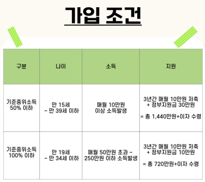 - 대상: 만 15세~39세, 월 10만 원 이상의 소득이 있는 청년
